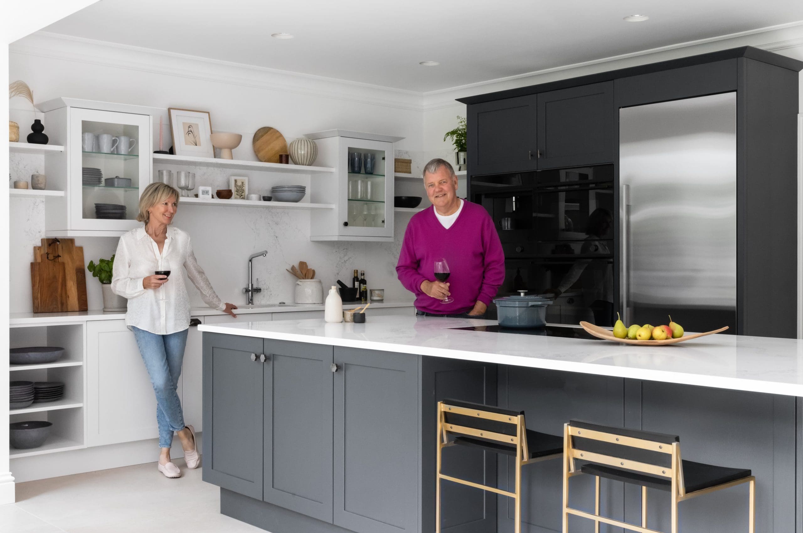 If one of us is working late at the 8-seater purpose-built quartz dining table while the other sizzles the evening meal, the whole vibe is ours to choose. If we are prepping to welcome a table-full of supper guests for the evening, we can lay places, decant wine and set the temperature for the night together. They are lucky to have a snug and comfy lounge area just through the kitchen double doors but, since the refit, the party usually stays in the kitchen. I love it because it’s ‘our’ communal area now.