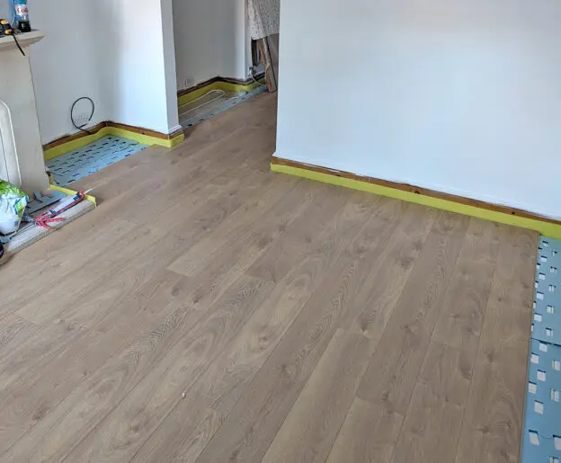 To maintain a consistent floor height between the extension and the original house, the newly screeded area was brought up to match the existing timber level — allowing the Rapid Response® boards to be laid continuously across the entire ground floor.